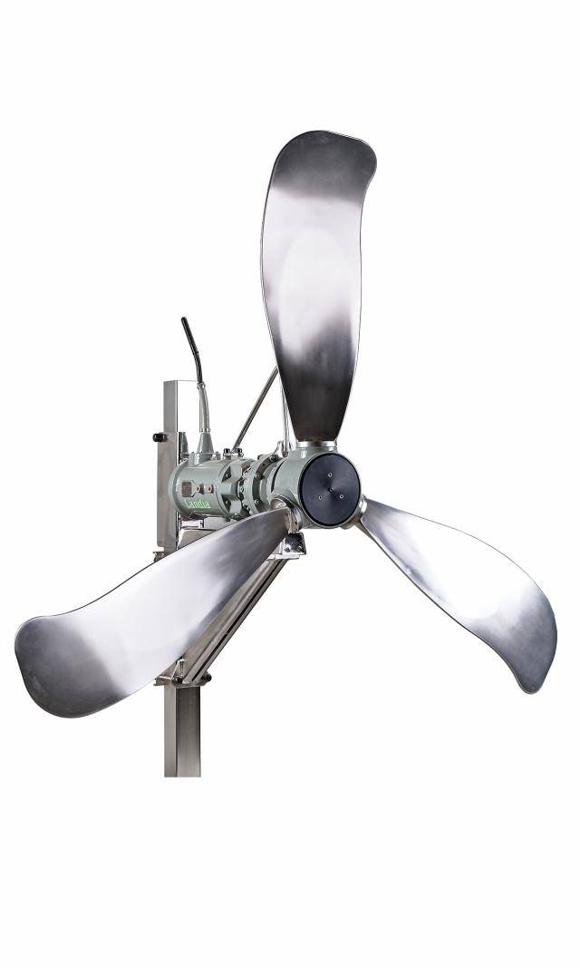The slowly rotating, stainless steel propeller ensures a gentle and energy-efficient mixing of the biomedia. The gentle mixing prevents wear. Landia Biomover ensures that the entire contents of the tank are kept in motion and that biomedia does not clog the grate or sediment on the bottom of the tank.