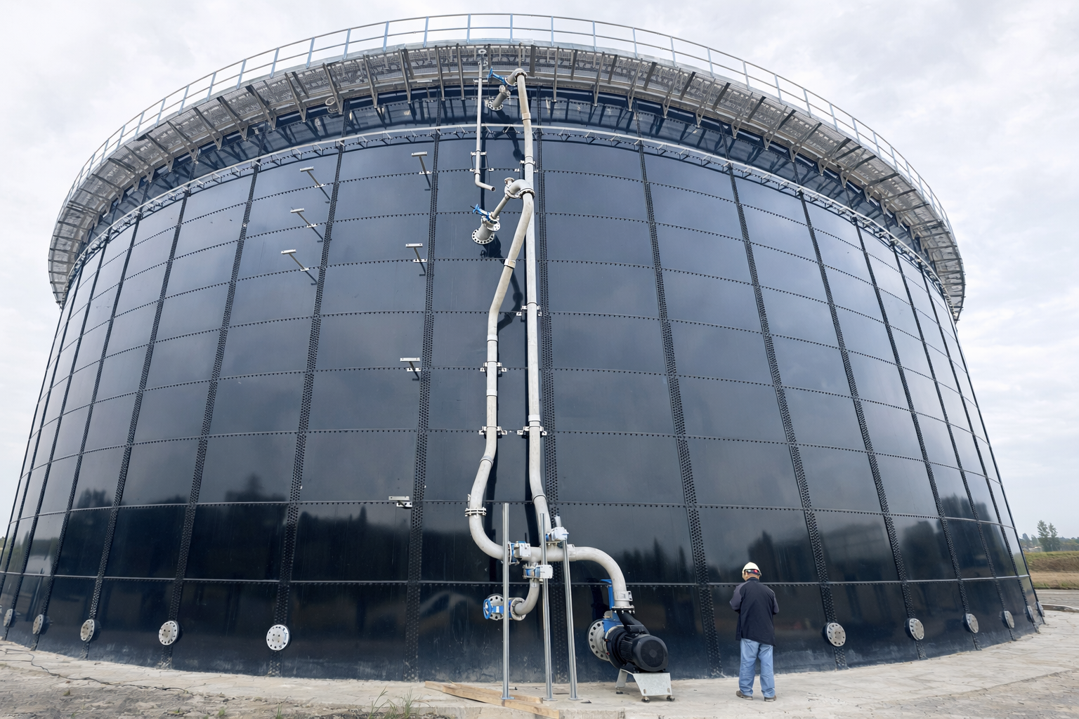 For two 6,450m3 (28m diameter) glass-lined bolted tanks, palm oil mill effluent (POME – at 5% total solids) is comprehensively mixed by Landia’s externally-mounted GasMix system, positioned with its ejector/diffusor at an intermediate height. The set-up also includes Landia JetMix mixing nozzles near the base of the tanks, and a higher, crust-breaking nozzle, likewise strategically positioned, to maximise biogas yields.